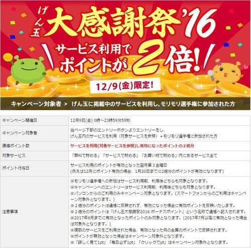 げん玉で驚きのキャンペーンが12月9日(金)1日限定で行われます。 なんと!遊んで貯める以外の全てのサービス利用でポイントが2倍になるキャンペーンです。 つまり100%還元商品も2倍、クレジットやFX申し込みなどの高額案件も2倍になります。(もり…